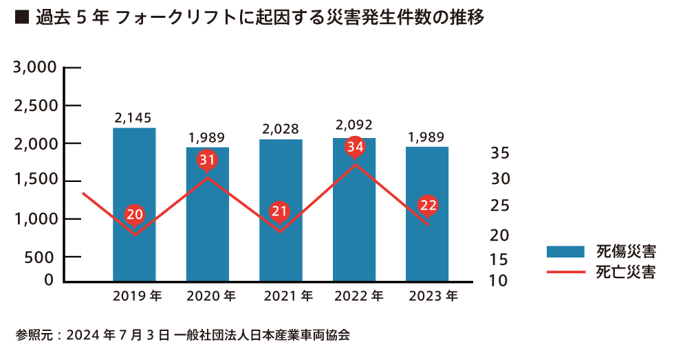 過去5年のフォークリフトに起因する災害発生件数の推移をみると、災害件数は大きく減少しておらず、死亡災害件数は増加と減少を繰り返しています。