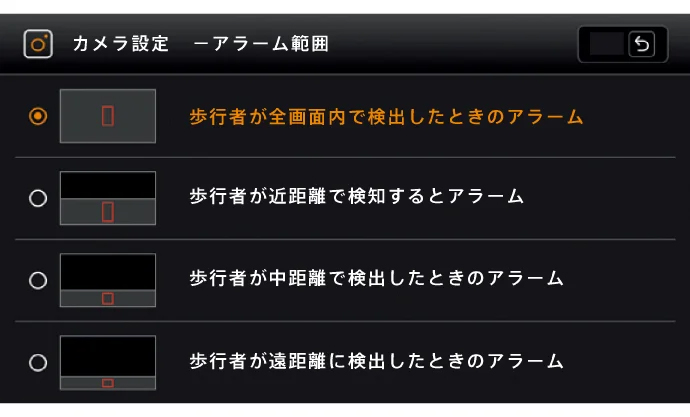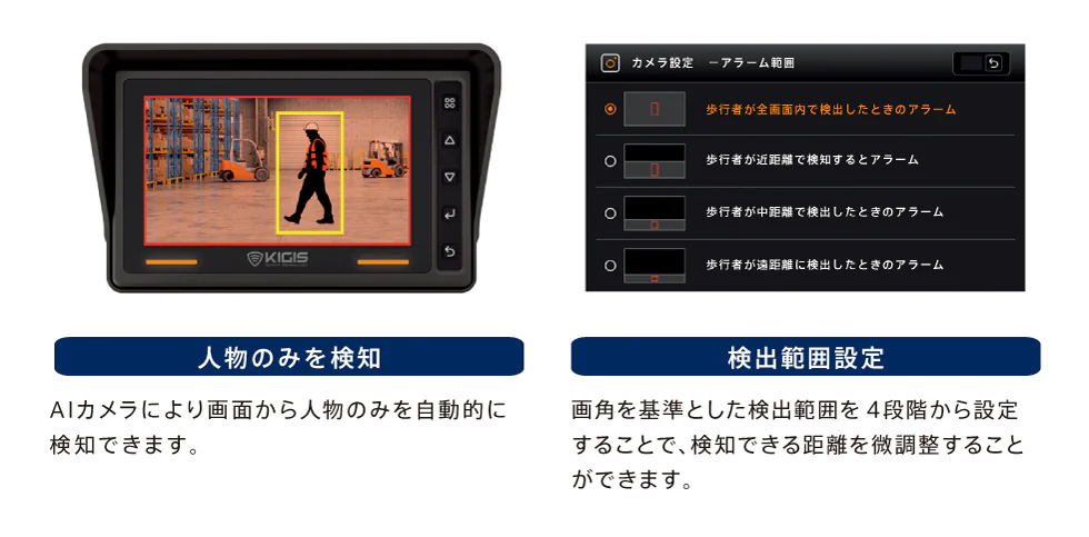 AIカメラにより人物のみを自動抽出します。検出距離の数値設定はできませんが、画角を基準とした検出範囲を設定することで、検知できる距離を微調整することができます。