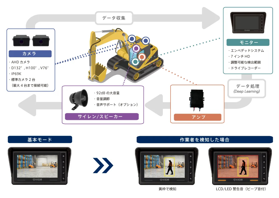 死角となる重機後方に最大4箇所小型AIカメラを設置。操縦席に設置した7インチモニターやサイレン/スピーカーを通じて人物の接近をオペレーターに警告します。